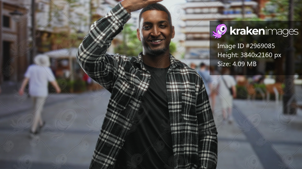 Young black man in plaid shirt raises his hand to forehead and offers a handshake on a street; friendly greeting.