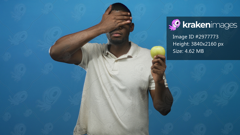 Young black man in studio holding a green apple in one hand while covering his eyes with the other hand in a posed offering gesture; temptation.