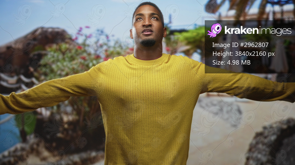 Young black man in yellow sweater with arms outstretched and eyes closed in studio against a blurred beach backdrop; calm reflection.