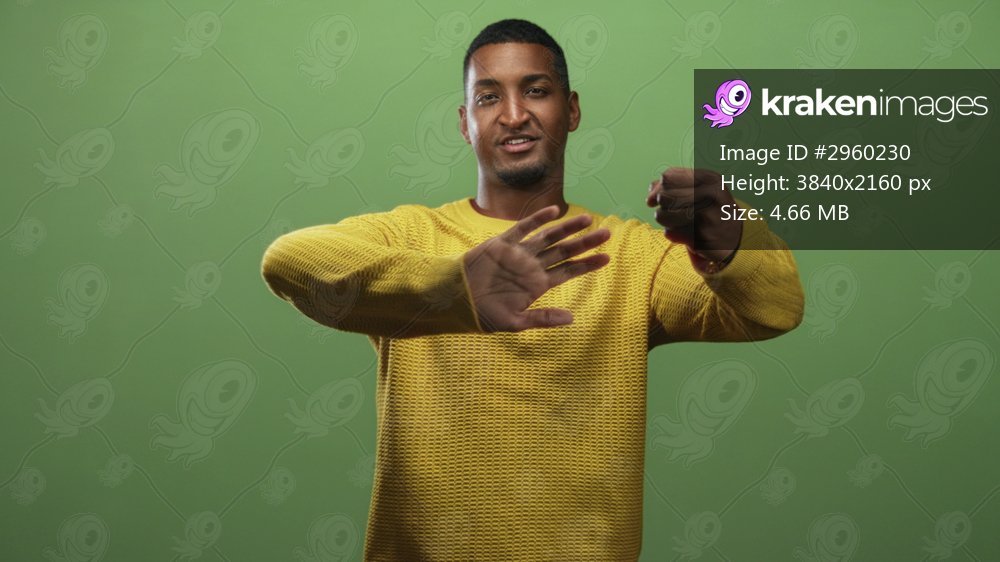 Young black man in yellow sweater gesturing with hands forward, miming holding or steering gesture in studio; welcoming.