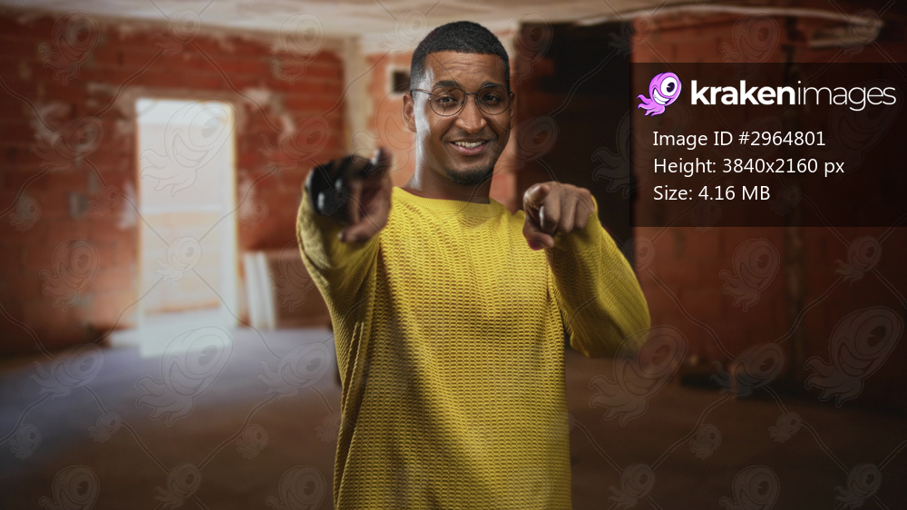 Young black man in yellow sweater with glasses points finger forward and smiles inside unfinished brick building; friendly confidence.