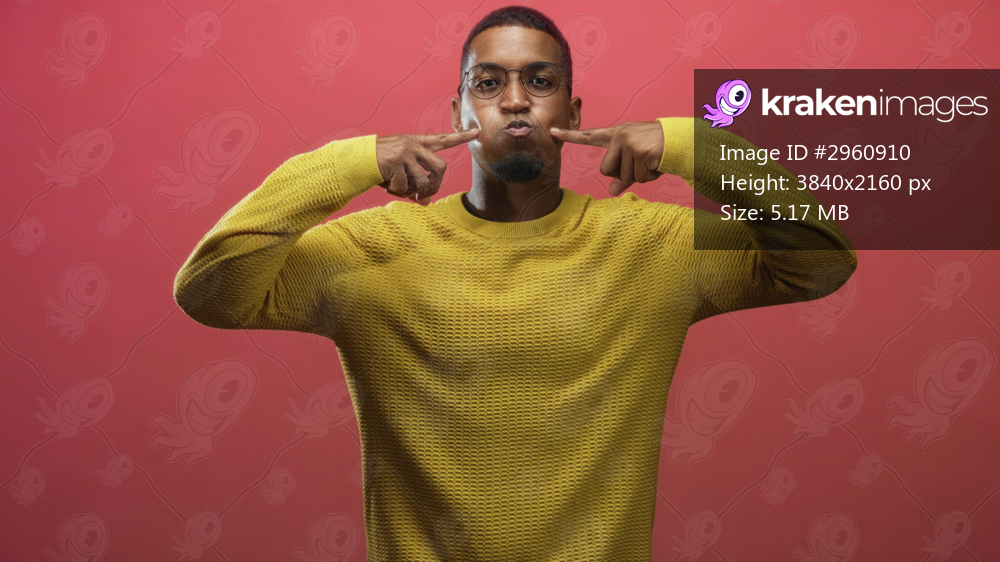 Young black man in yellow sweater and glasses points index fingers to cheeks while puffing lips in studio; playful expression.