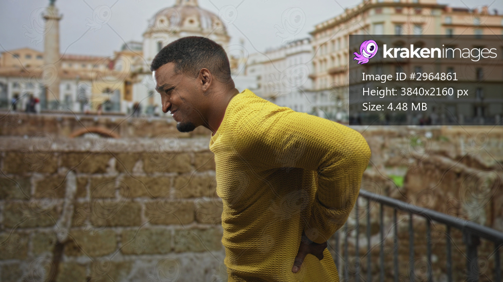 Young black man in yellow sweater holding hand on lower back for backache, wincing and bending slightly against a stone railing at a building; discomfort resilience. - Kraken Images