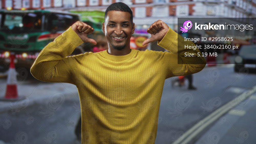 Young black man in yellow sweater points thumbs to chest beside green bus and traffic cones on a busy city street; confidence.