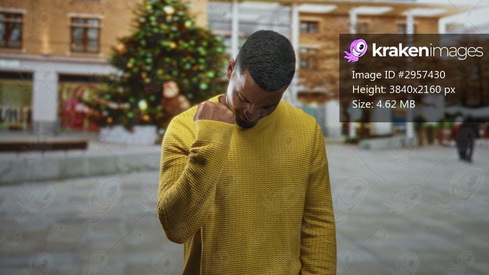 Young black man in yellow sweater raises his fists in a decorated street with a large christmas tree; quiet triumph.