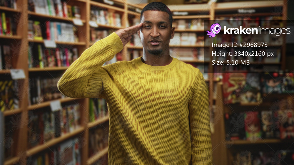 Young black man in yellow sweater salutes with right hand to forehead inside a bookstore building; confidence focus.