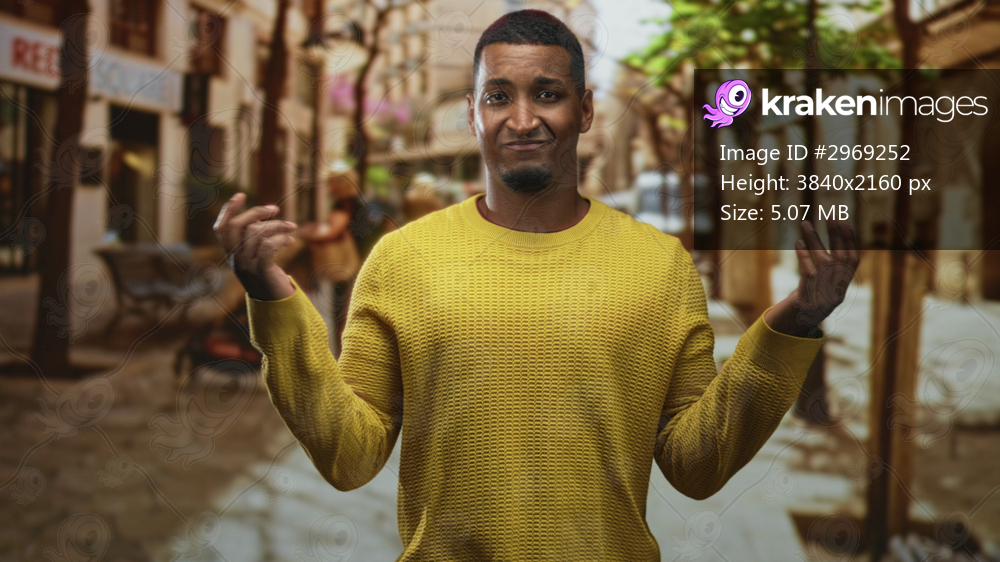 Young black man in yellow sweater shrugs and gestures with hands on a street lined with shops and benches; uncertainty questioning.