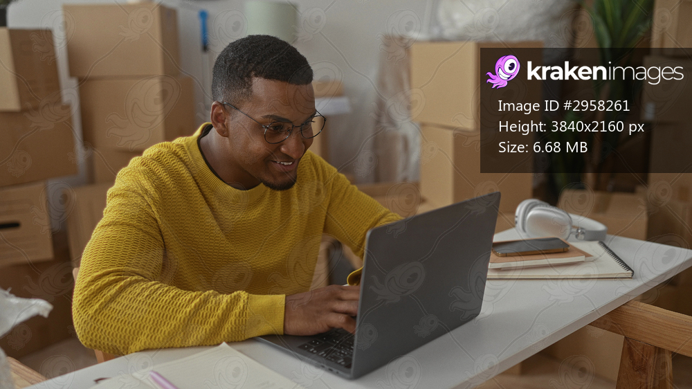 Young black man in yellow sweater typing on laptop with hand to cheek, wearing glasses near stacked moving boxes and headphones on table in studio; planning transition contemplation. - Kraken Images