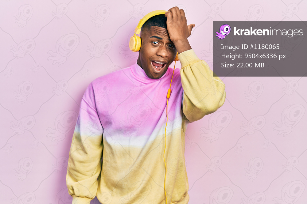 Young black man listening to music wearing headphones surprised with hand on head for mistake, remember error. forgot, bad memory concept.
