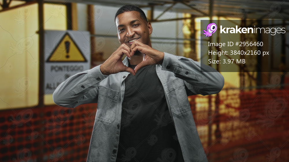 Young black man makes a heart with his hands in a building construction zone with orange safety netting and a warning sign; warm affection.