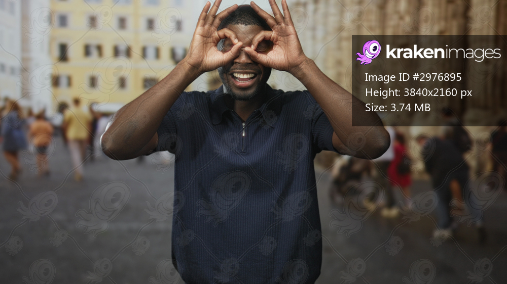 Young black man making binoculars with his hands over his eyes, smiling in a crowded street near tall columns and a building; playful joy.