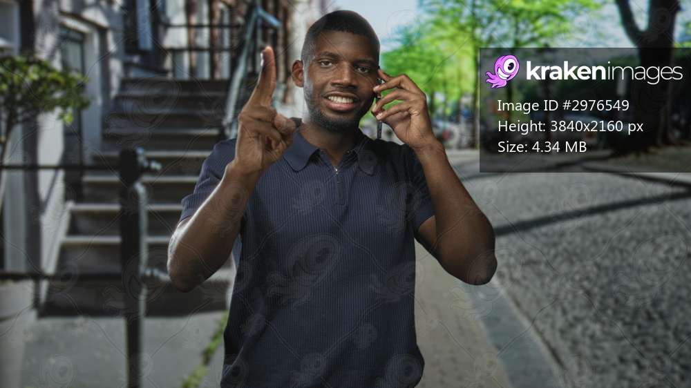 Young black man on street holding smartphone to ear and pointing index finger, smiling near stoop and parked car; confidence communication.