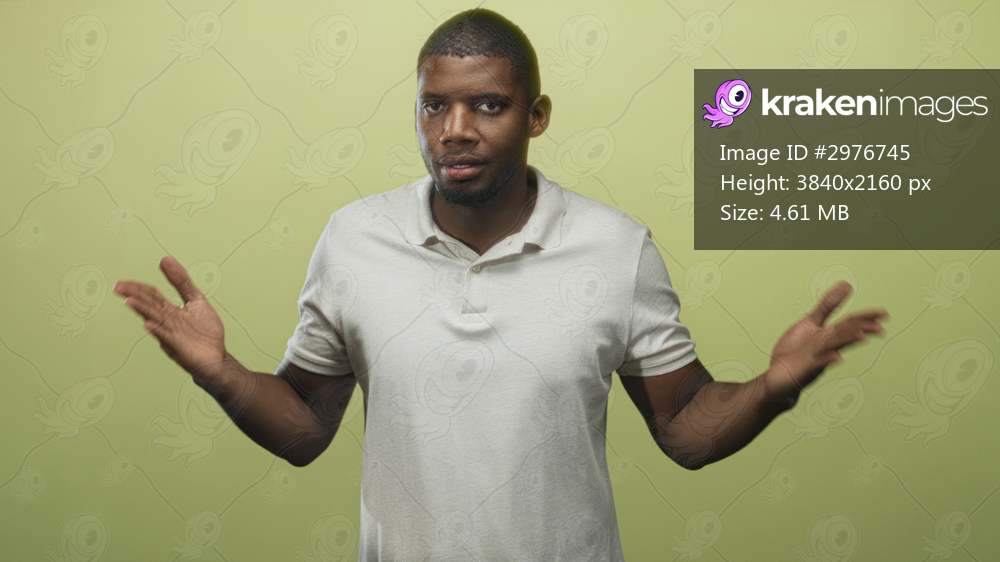 Young black man with palms up shrug gesture in studio, wearing white polo, eyes closed and relaxed posture; uncertainty.