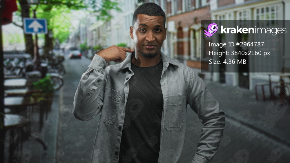 Young black man pointing a finger at camera while touching his neck on a street with townhouses and an outdoor cafe; confidence.