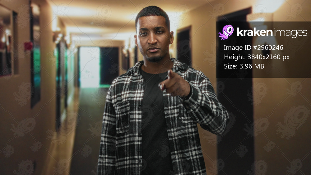 Young black man pointing finger and standing in a hotel corridor wearing a black t shirt and plaid shirt inside building; confidence.