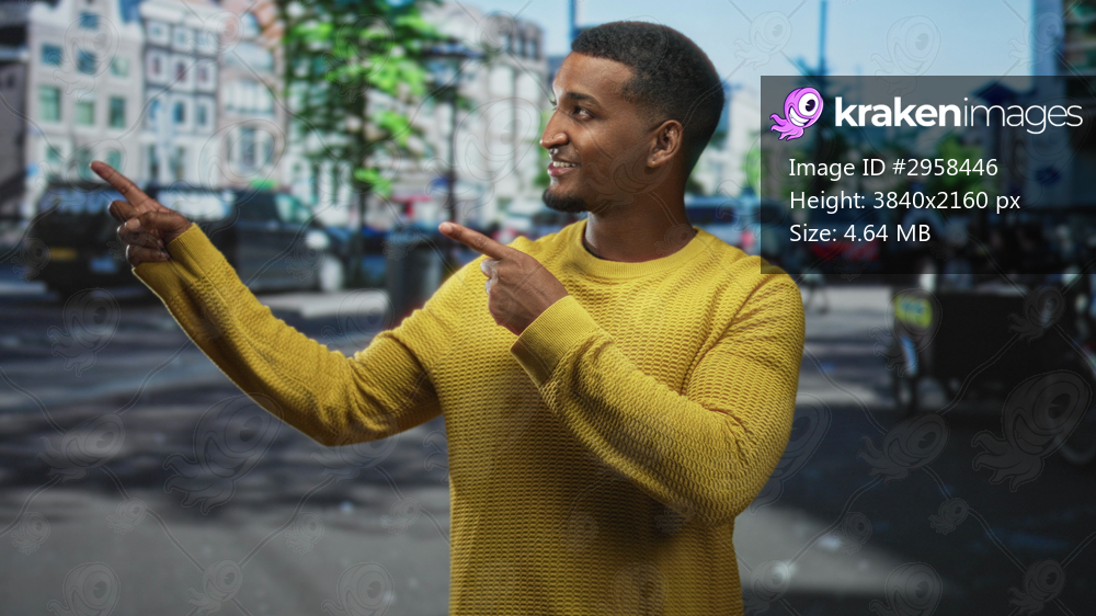 Young black man pointing fingers with both hands on a busy city street among cars and bicycles; confidence direction.