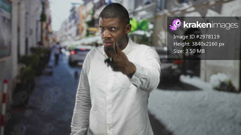 Young black man pointing index finger at camera, white button shirt, intense stare in a narrow urban street with parked cars and storefronts; anger confrontation. - Kraken Images