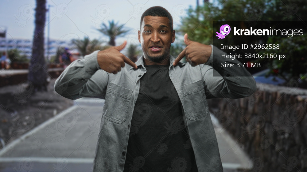Young black man pointing to his hands on a street walkway beside a stone wall and palm trees, wearing gray overshirt and black tshirt; confidence.