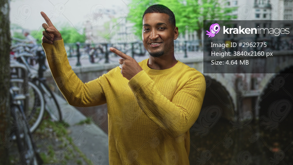 Young black man points both fingers at a canal bridge while wearing a yellow sweater on a street smiling and gesturing; confidence welcome.