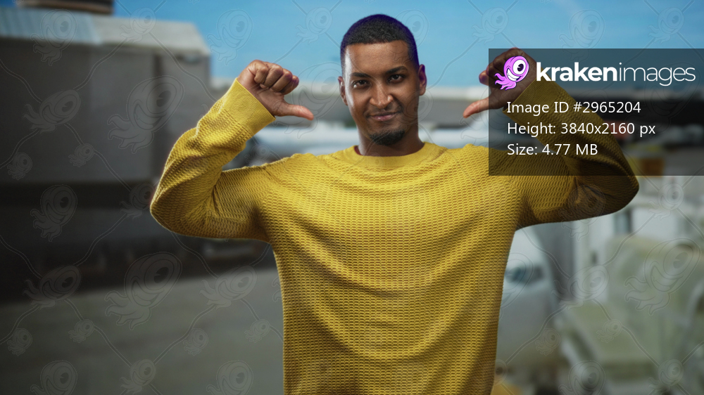 Young black man points both thumbs to chest in yellow sweater at airport terminal with airplane behind; confidence.