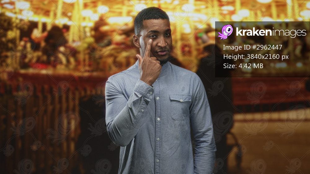Young black man points finger to cheek beside a carousel and wooden fence in a street fair setting; confidence.