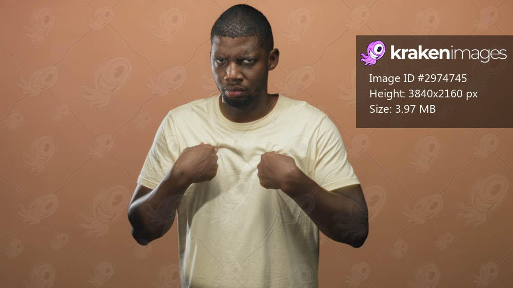 Young black man points finger to chest in studio, tense furrowed brow and closed posture suggesting accusation; defensive doubt.
