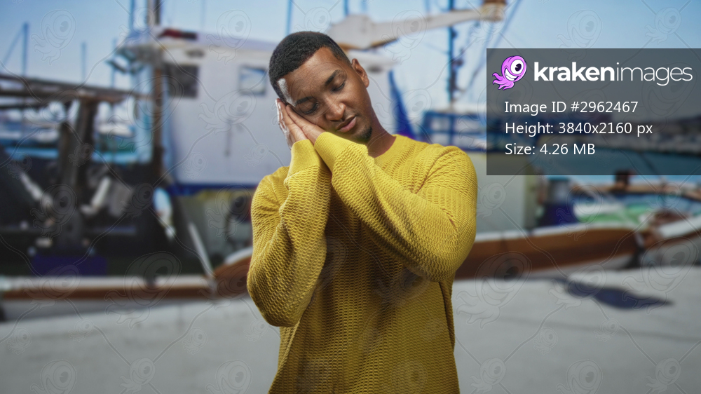 Young black man pressing hands to cheek in sleeping gesture wearing yellow sweater at studio; calm reflection.