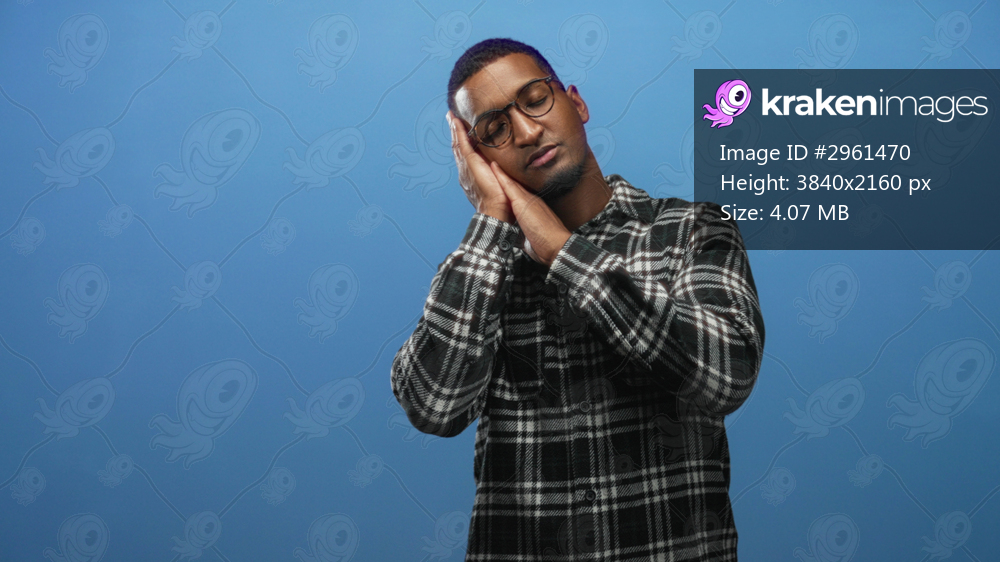 Young black man rests hands against cheek with closed eyes in studio, making a sleeping gesture; calm rest.