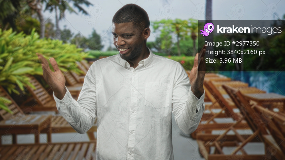 Young black man smiling with hands apart presenting pool chairs on a tropical pool deck building; relaxation.