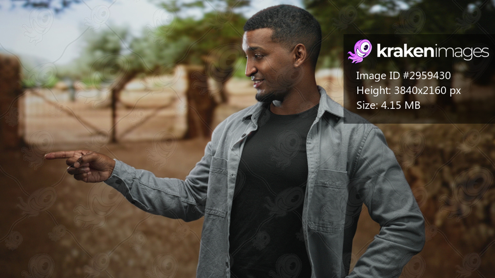 Young black man standing with hand on hip by a metal gate and stone wall on a rural street; confidence.