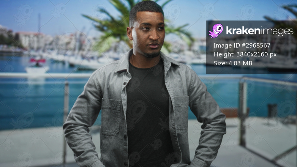 Young black man standing with hands on hips beside marina railing on a building terrace overlooking yachts and water; confidence.