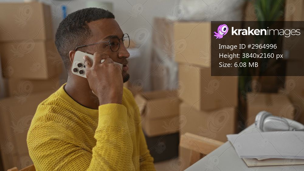 Young black man talking on smartphone, hand to ear near cheek, yellow sweater and glasses, seated at table with papers and headphones amid stacked moving boxes in studio; focused planning. - Kraken Images