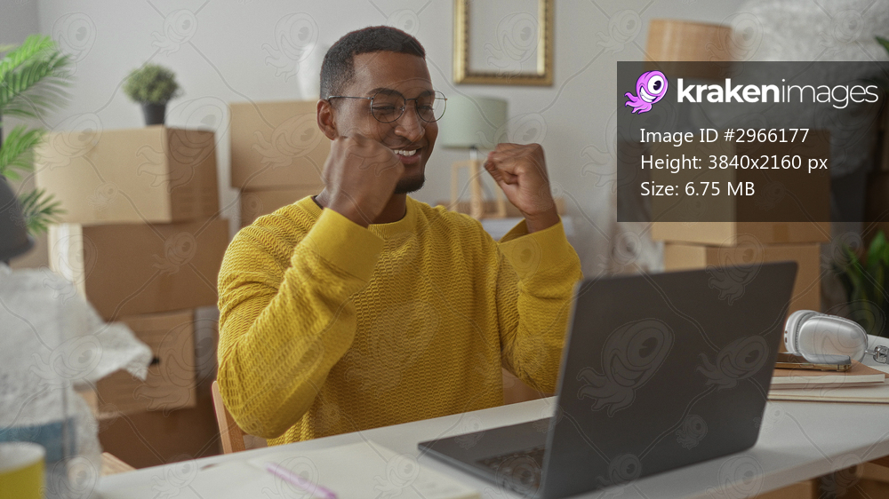 Young black man typing on laptop and pumping fist amid packed moving boxes in building; success focus.