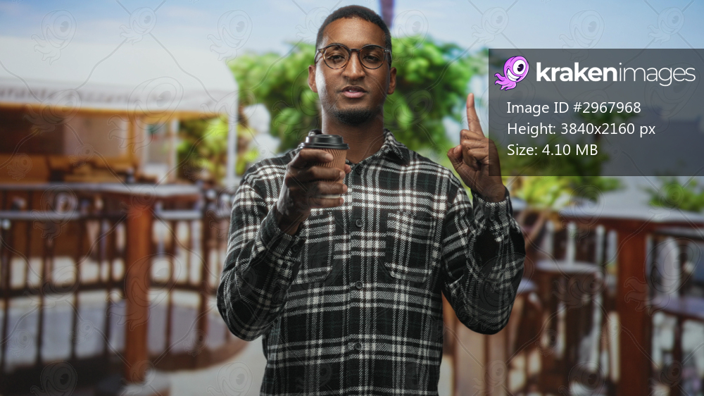 Young black man wearing glasses and a plaid flannel shirt holding a coffee cup and pointing finger in a building cafe patio; confidence.