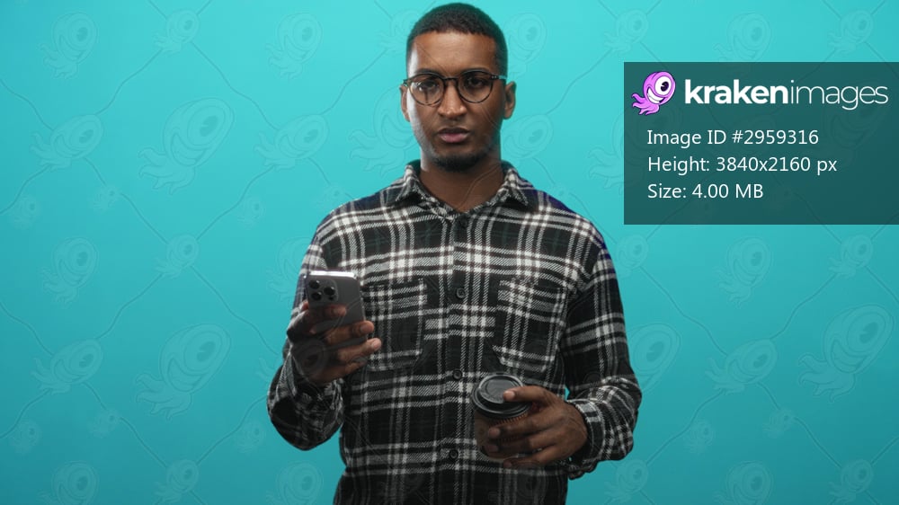 Young black man wearing glasses and a plaid shirt, holding smartphone and takeaway coffee cup, looks at phone in studio; focused morning routine.