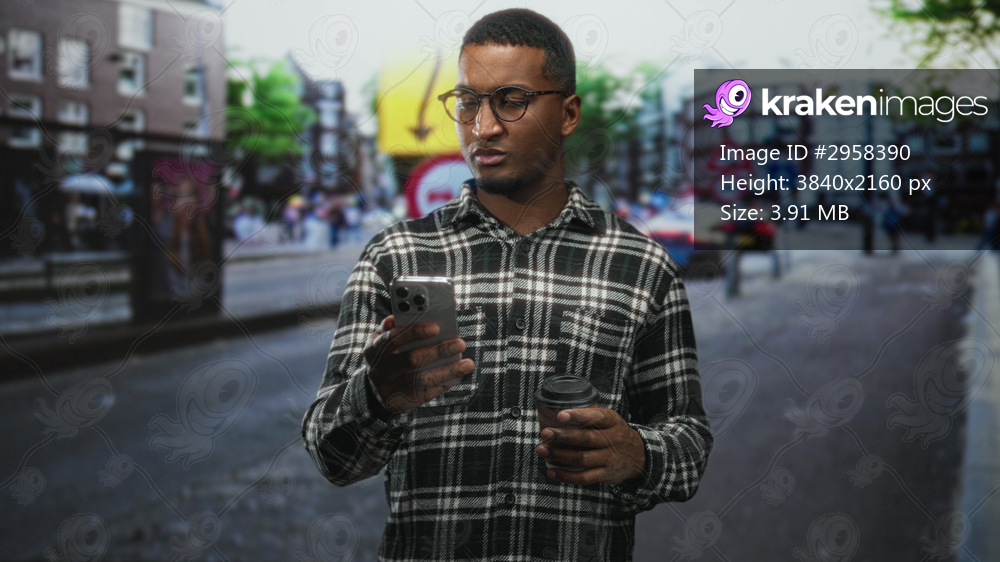 Young black man wearing glasses holds a smartphone and a takeaway coffee cup, looking at the phone screen while standing on a busy city street; pensive focus. - Kraken Images