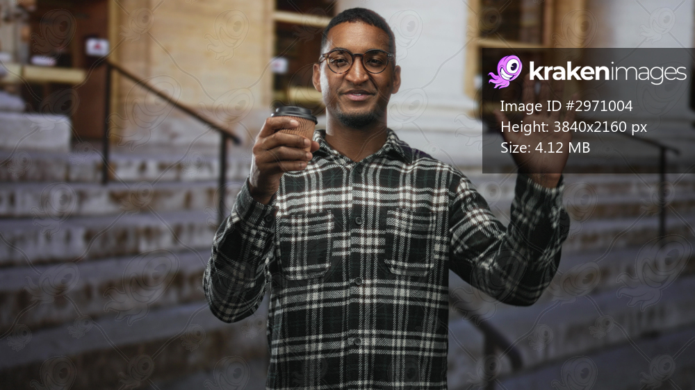 Young black man wearing glasses and plaid shirt holding a takeaway coffee cup and waving right hand at a stone building entrance with steps; friendly greeting. - Kraken Images