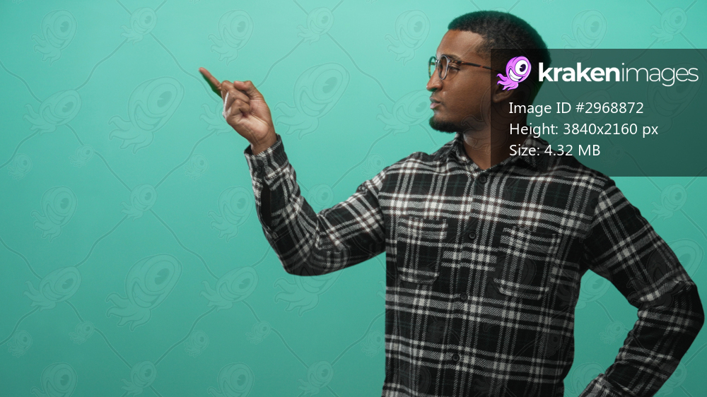 Young black man wearing glasses and plaid shirt points finger and shows open hand palm in studio with teal backdrop; curiosity contemplation.