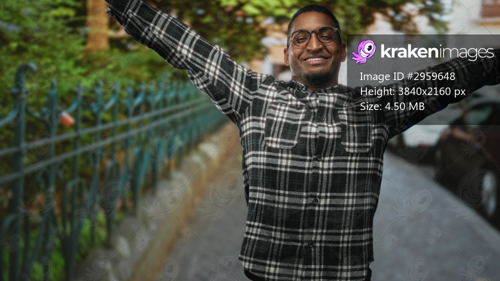 Young black man wearing glasses raises arms in celebration after briefly bringing hands to mouth on a street; joy celebration.