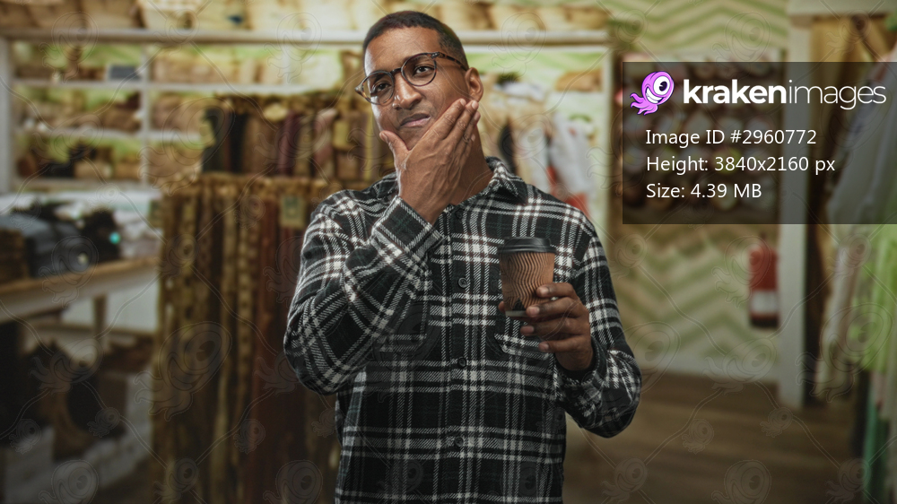 Young black man wearing plaid shirt and glasses holding coffee cup and touching chin in boutique building; thoughtful reflection.