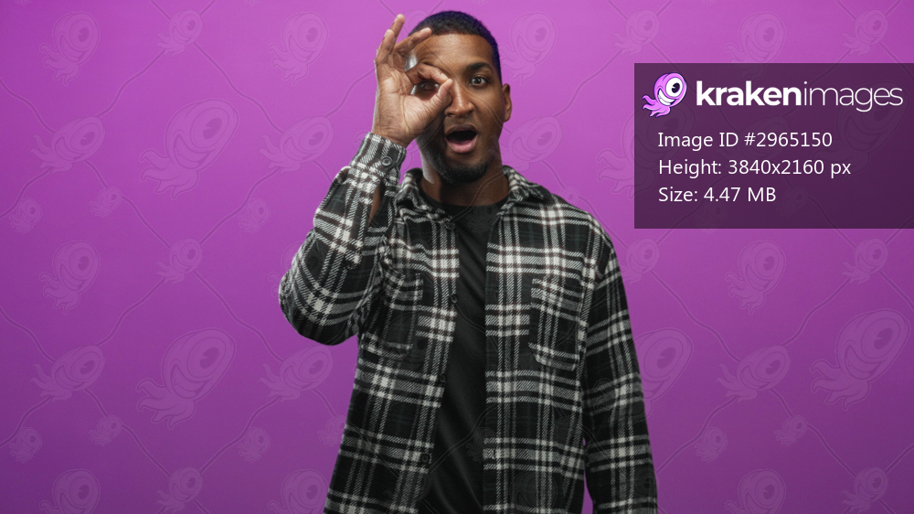 Young black man wearing plaid shirt makes ok sign with hand over eye in studio with purple backdrop; playful curiosity.