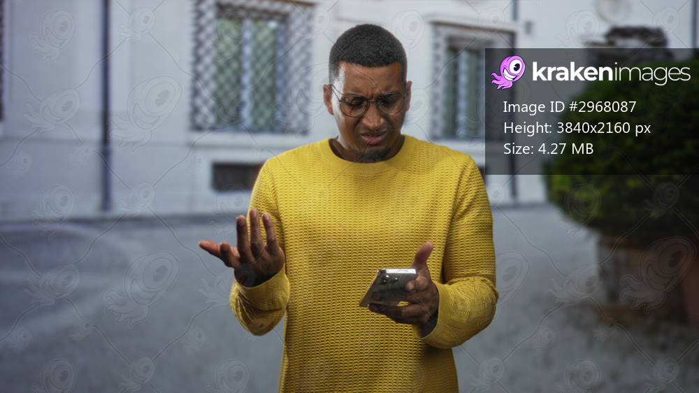 Young black man wearing yellow sweater and glasses holding smartphone with palm up questioning gesture on street in front of a building; frustration.