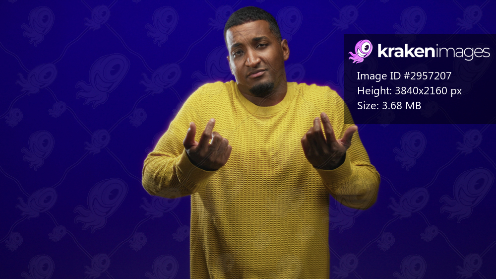 Young black man wearing yellow sweater shrugging with both hands open, palms up and shoulders raised, eyes half closed, in studio with solid blue backdrop; uncertainty. - Kraken Images
