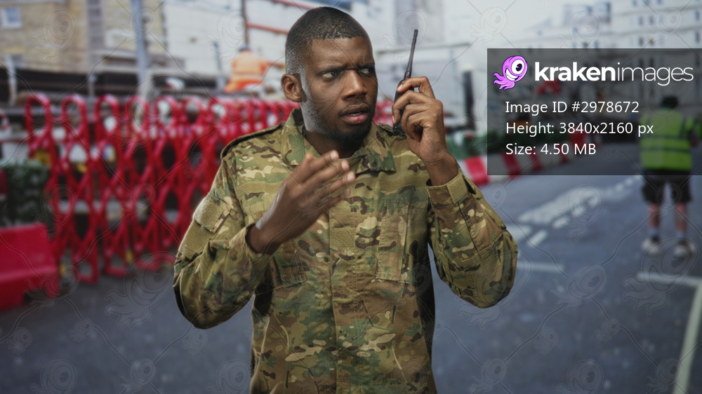 Young black soldier man covering mouth with hand while speaking into radio on urban street during roadworks; concern duty.