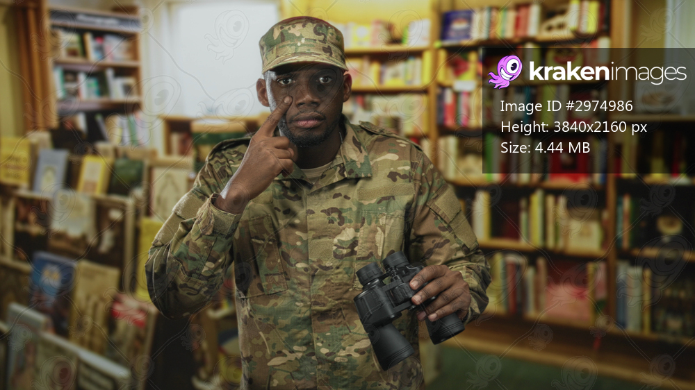 Young black soldier man holding binoculars with finger to eye while standing among crowded bookshelves in bookstore; vigilance duty.