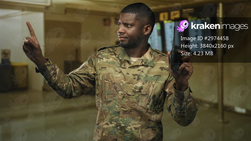 Young black soldier man in camouflage uniform holds radio and points index finger toward departure board in airport terminal; vigilance duty.