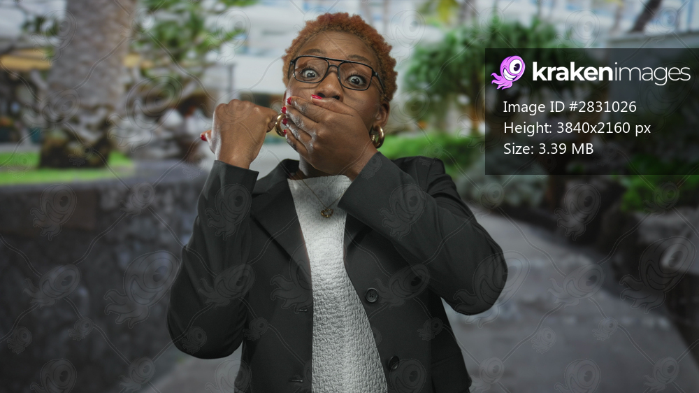 Young black woman covering mouth and raising fist in green park with leafy stone path backdrop; silent strength.