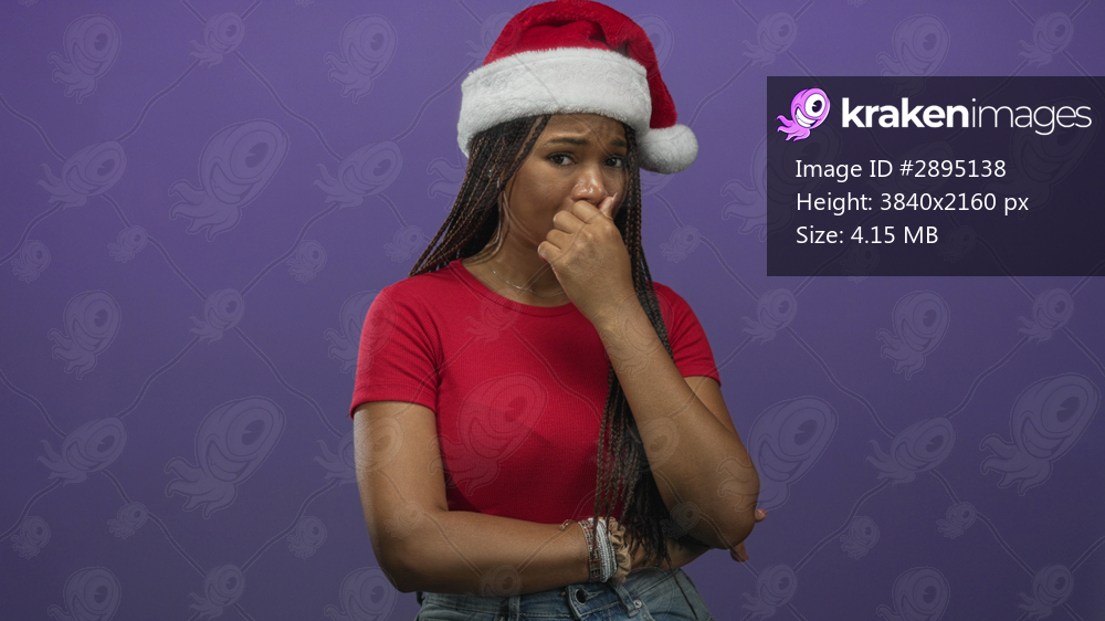 Young black woman in purple studio wearing santa hat holding hand to mouth and crossed arms; holiday anxiety.
