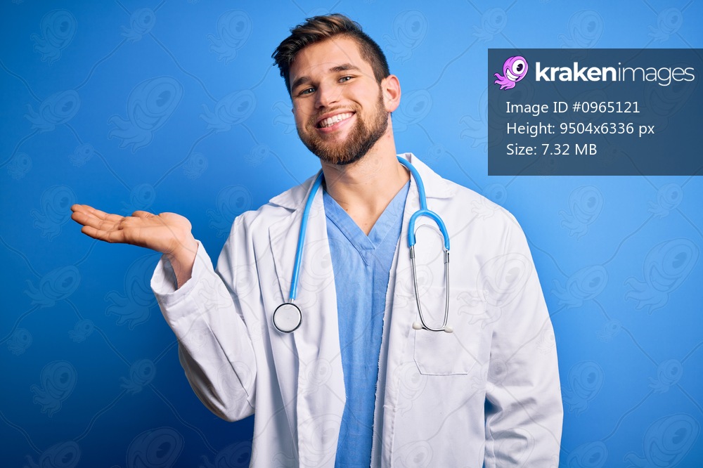 Young blond doctor man with beard and blue eyes wearing white coat and stethoscope smiling cheerful presenting and pointing with palm of hand looking at the camera. - Kraken Images