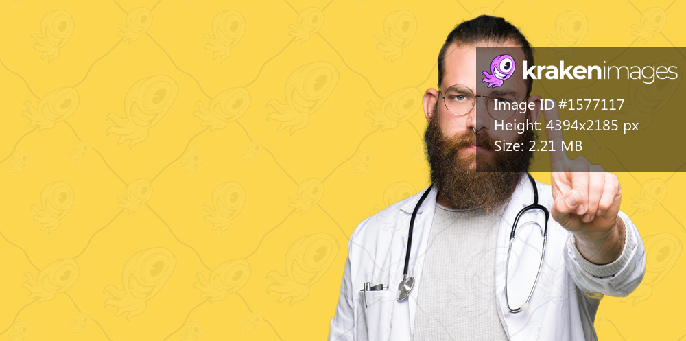 Young blond doctor man with beard wearing medical coat Pointing with finger up and angry expression